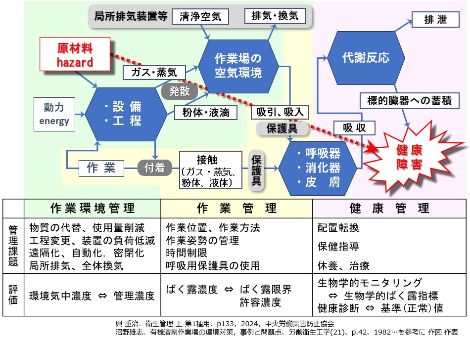 図表ー1は、有害物質の取扱いに係る労働衛生3管理の課題と関係である。左上の原材料が有害(ハザード)であった場合、そのハザードが、生産プロセスと作業者との関わりによって、右下に向かう結果がリスクとなり、そのリスクが許容限度を超えた場合に健康障害に至る可能性が“大”となる。